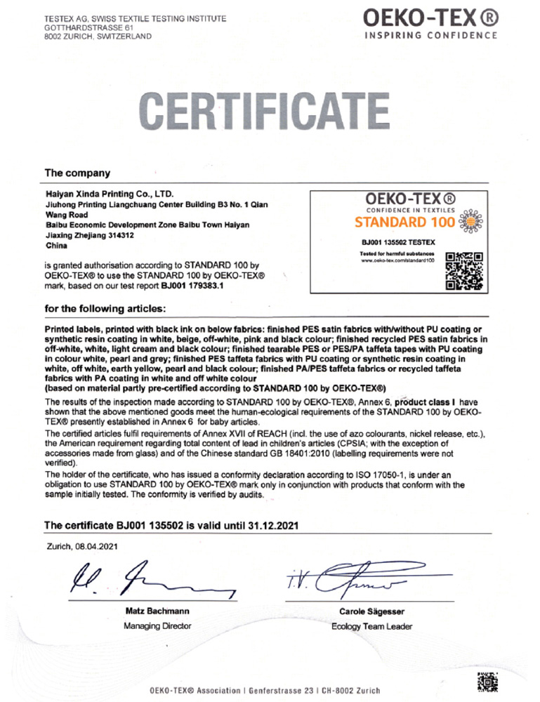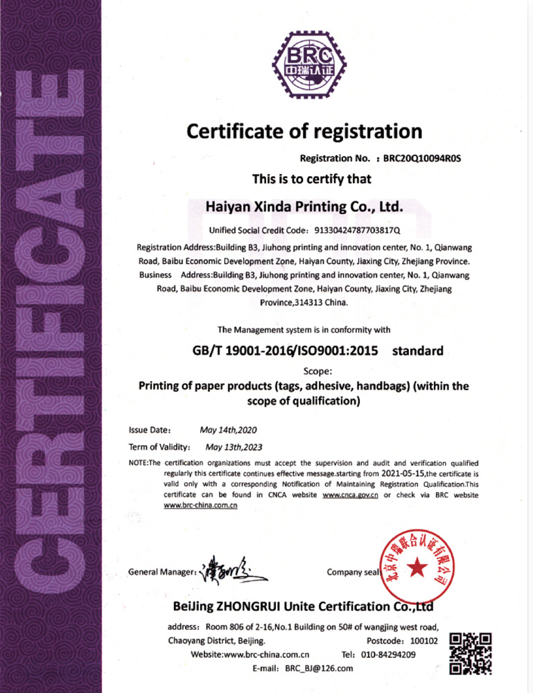 Haiyan Xinda Printing Co., Ltd. was established on April 6, 2006 with a registered capital of 2 million yuan. It is a modern management production enterprise integrating trademark design, printing and weaving. There are 120 on-the-job employees. Specializing in all kinds of printed matter, all kinds of clothing accessories and all kinds of handbag food bags. In order to meet the market challenge with a better momentum, enterprises constantly introduce advanced technology, recruit talents and try to develop new products in combination with customer requirements.